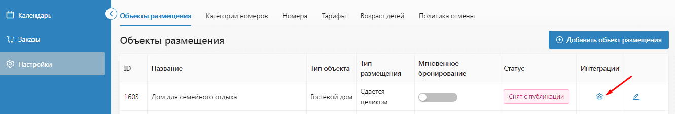 Шаг 3. Выберите нужный объект и нажмите на шестеренку в столбце «Интеграции»