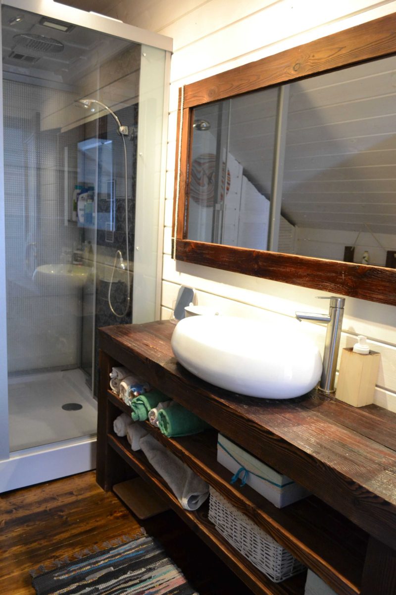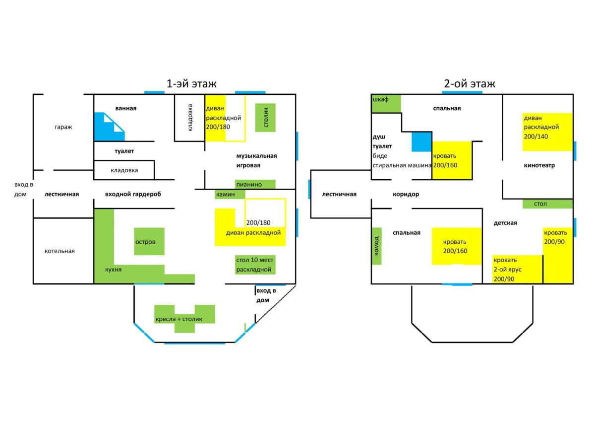 1 эый этаж — кухня-гсотинная с двухспальным диваном, спальня с двухспальным диваном + большая душевая и отдельный туалет, теплая виранда с панорамным окном