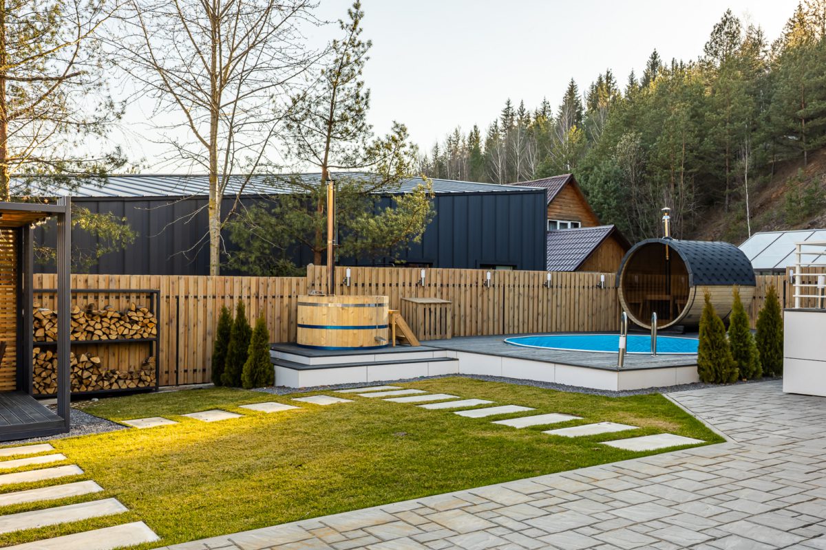 Территория Рядом с домом находиться баня на дровах, которая включает в себя парную с веником, душевую, и комнату отдыха. Здесь вы можете попариться с ароматным веником, принять теплый душ, после чего окунуться в прохладный бассейн с размером 4,5х2,2 метра.