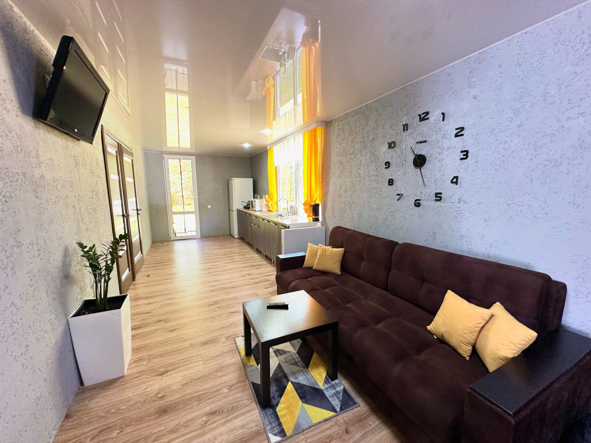 Вместительность 10 человек. В доме есть 4 комнаты в каждой 2-х спальная кровать, прихожая с большим диваном и уличная терраса с качелями. На территории собственная скважина.