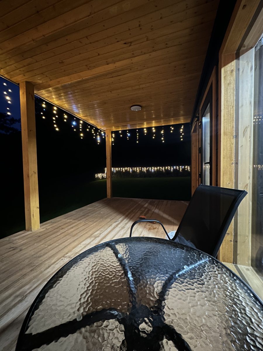 В доме две террасы. Маленькая, выход к которой осуществляется через сауну, и большая (18 м2), где есть стол и стулья для отдыха, общения, и совместного времяпровождения в любую погоду, так как терраса крытая.